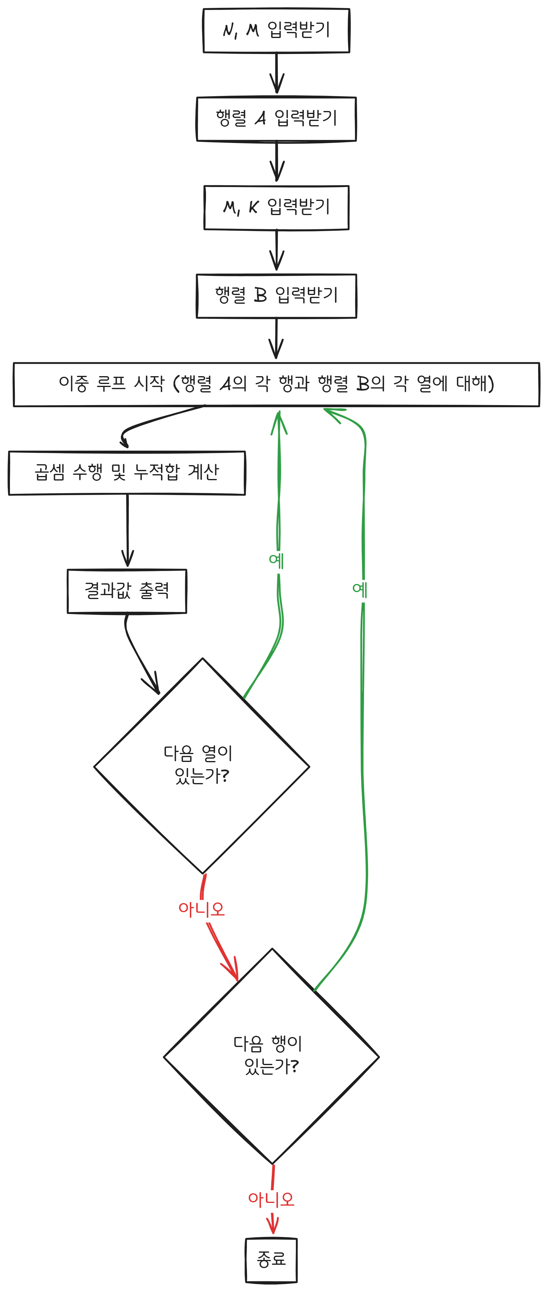 - 첫번째 행렬의 행에 대해, 그리고 두번째 행렬의 열에 대해 반복문을 돌며 각 요소들을 곱해 최종적으로 더하는 구조를 진행하였습니다.