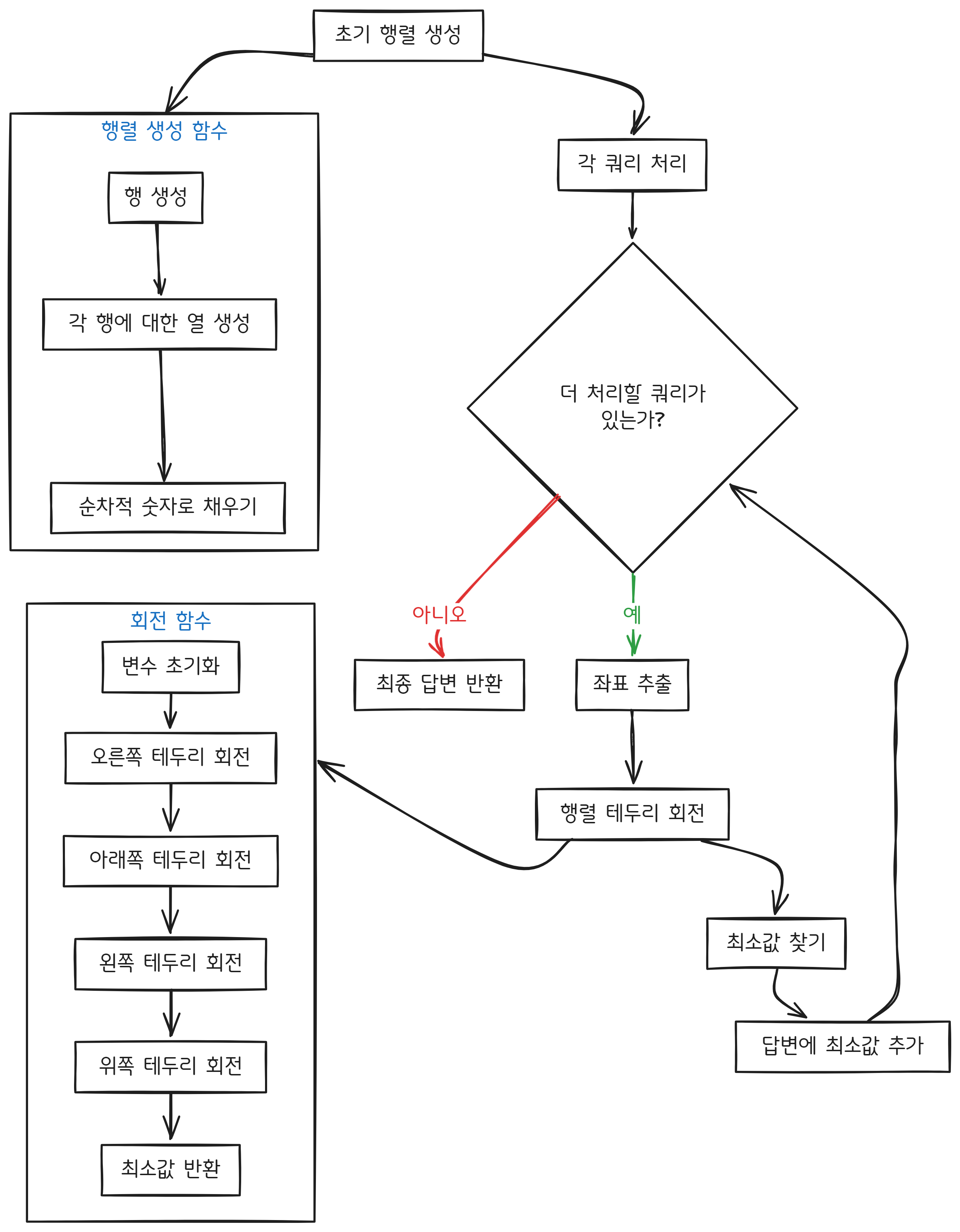 - 문제의 로직 자체는 간단했습니다. 행렬을 주어진 조건대로 생성하고, 주어진 범위 내에서 원소들을 한 칸씩 움직일 수만 있다면 풀어낼 수 있었던 문제였습니다.