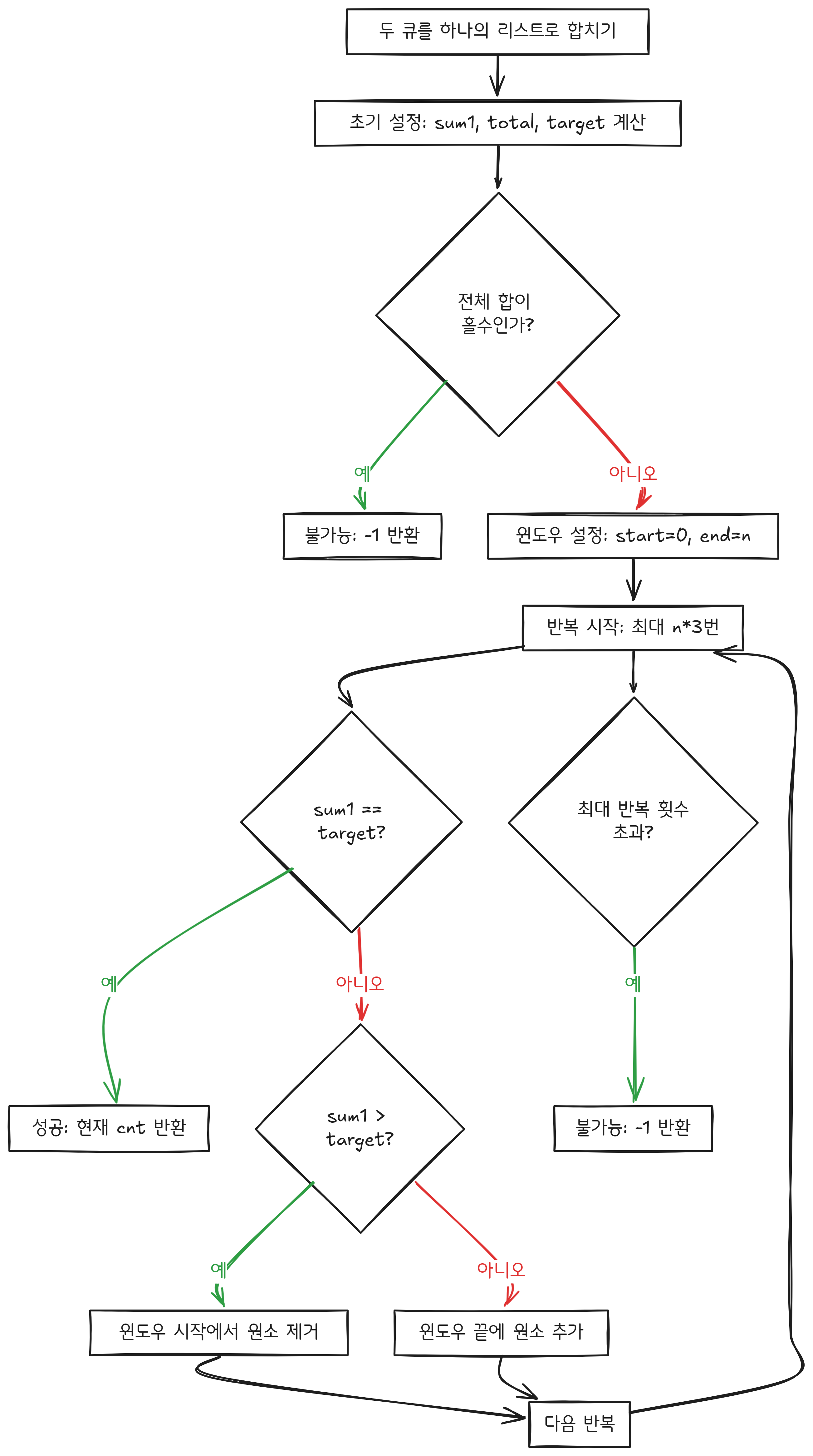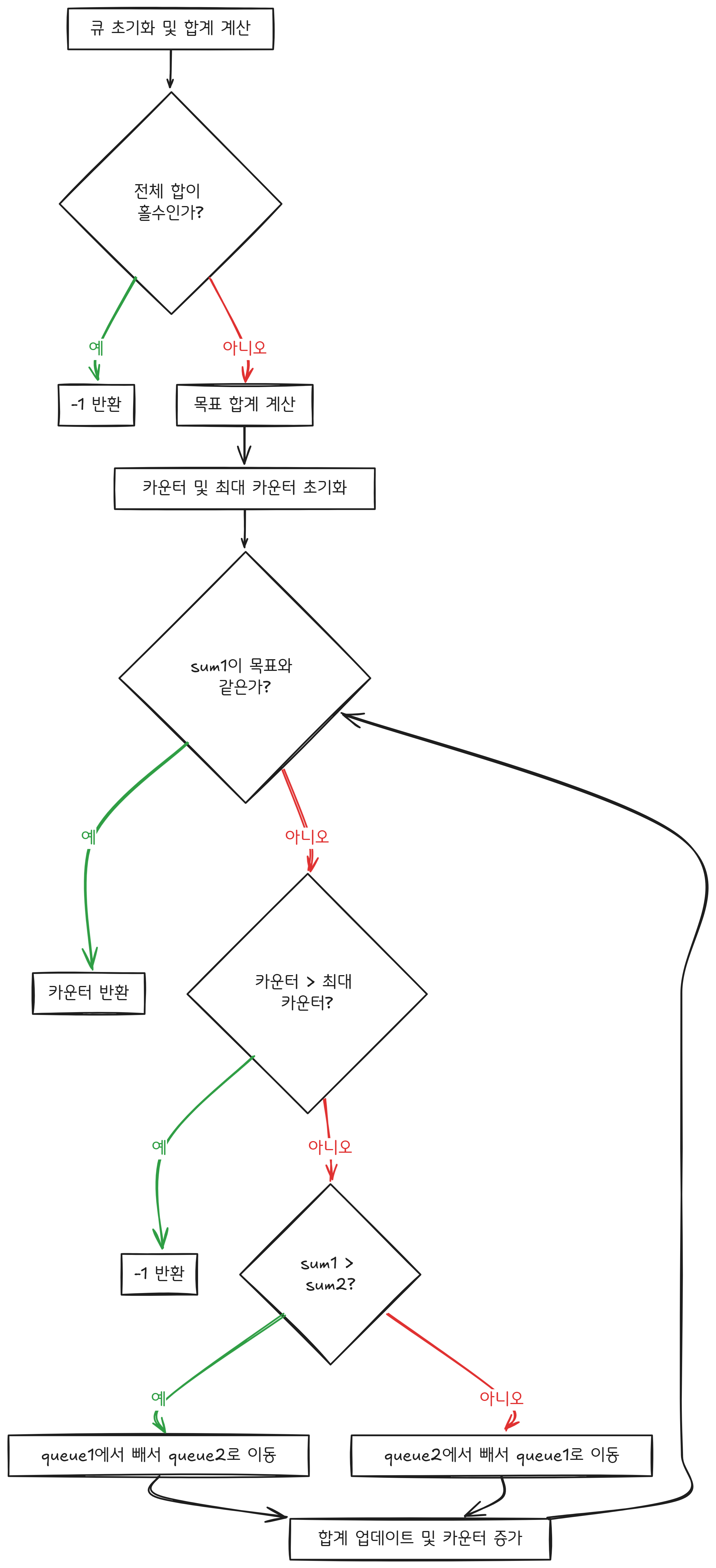 - 우선 두 큐의 총합이 홀수인 경우에는 두 큐의 합을 같게 만들 수 없기 때문에 처리를 해주었고,