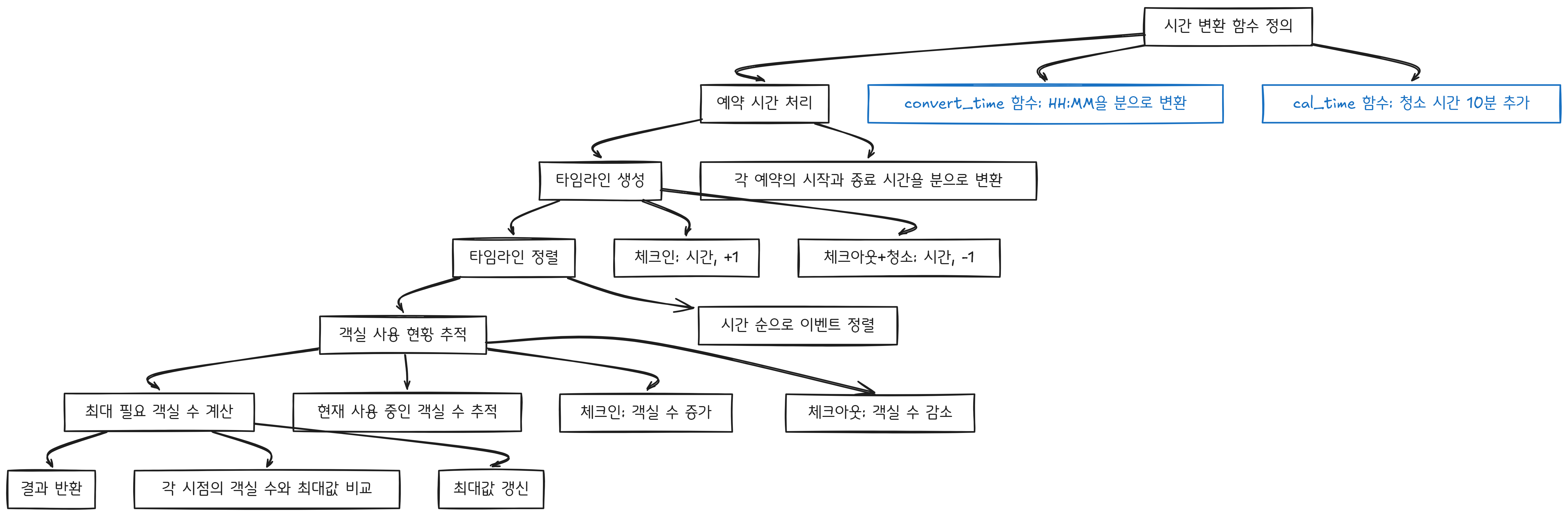 - 사실 timeline의 문자열들(체크인, 체크아웃 시간)을 바로 정렬하여 문제를 풀 수도 있었지만, 문제에서 '예약 시각이 자정을 넘어가는 경우'가 없었기에 시간을 분 단위로 변환하여 푸는 방법을 택하게 되었습니다.