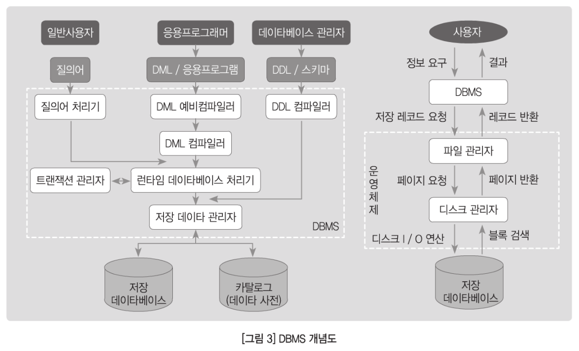 - DBMS: 데이터베이스를 구축하고 이용하는 기능을 제공하는 소프트웨어