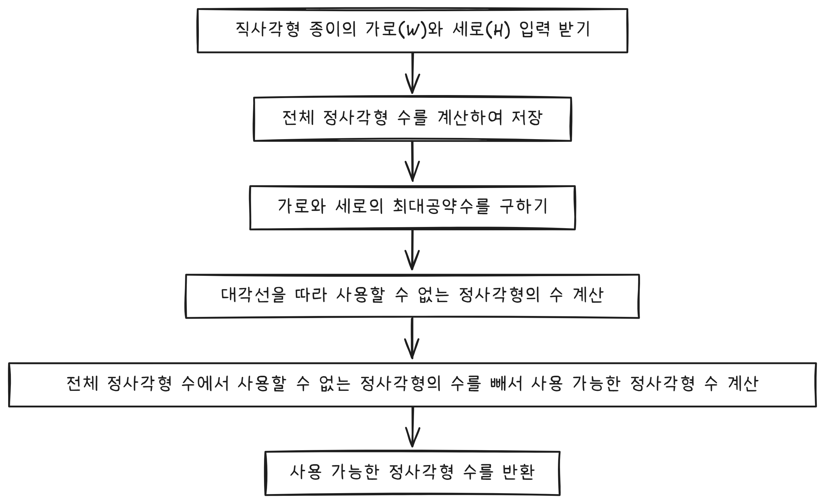 - 문제에서 사용할 수 있는 정사각형의 개수를 구하기 위한 핵심은 대각선이 몇 개의 정사각형을 지나가는지 파악하는 것입니다.