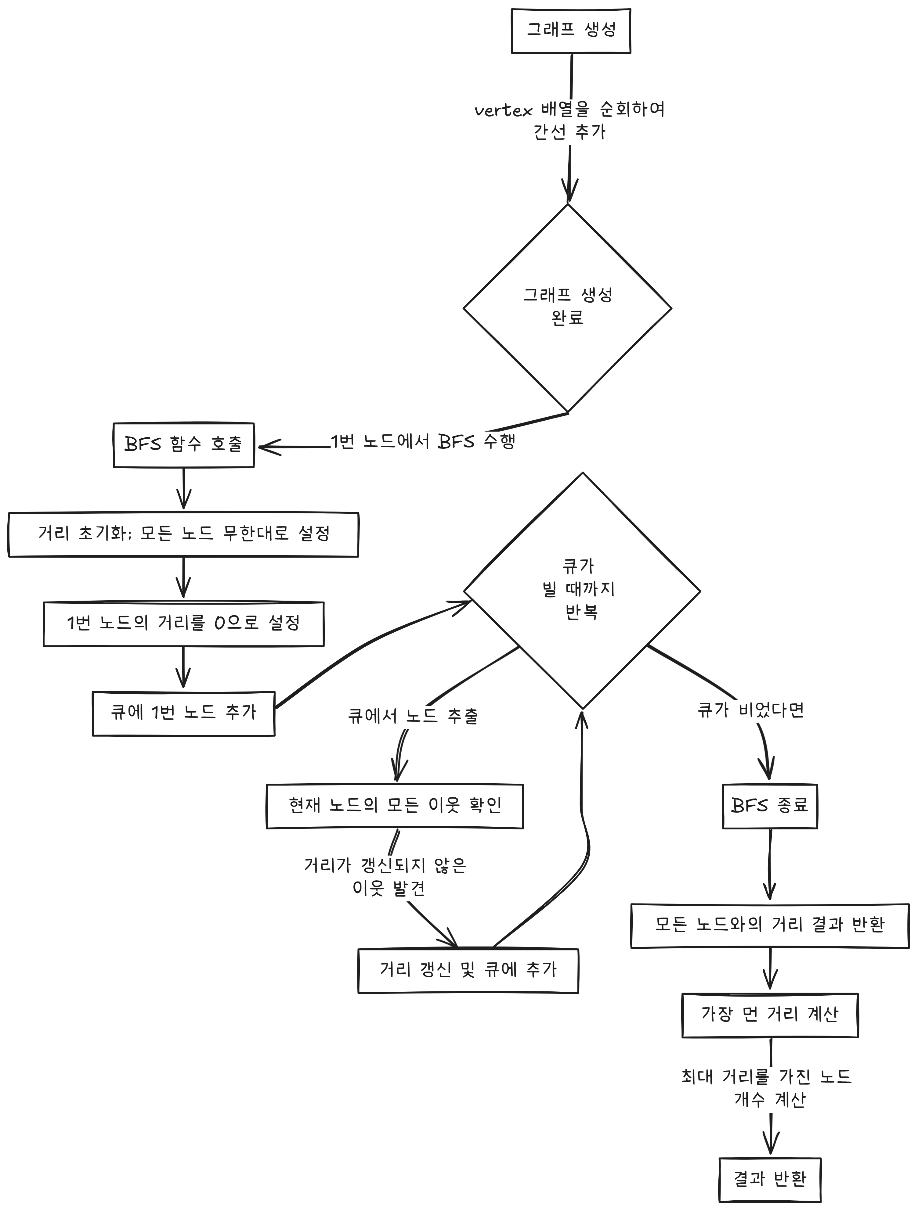 - 마지막으로 거리 정보를 반환하여 그 중 최댓값을 가지는 노드들이 몇 개인지 파악하여 결과를 출력하도록 구현해보았습니다.