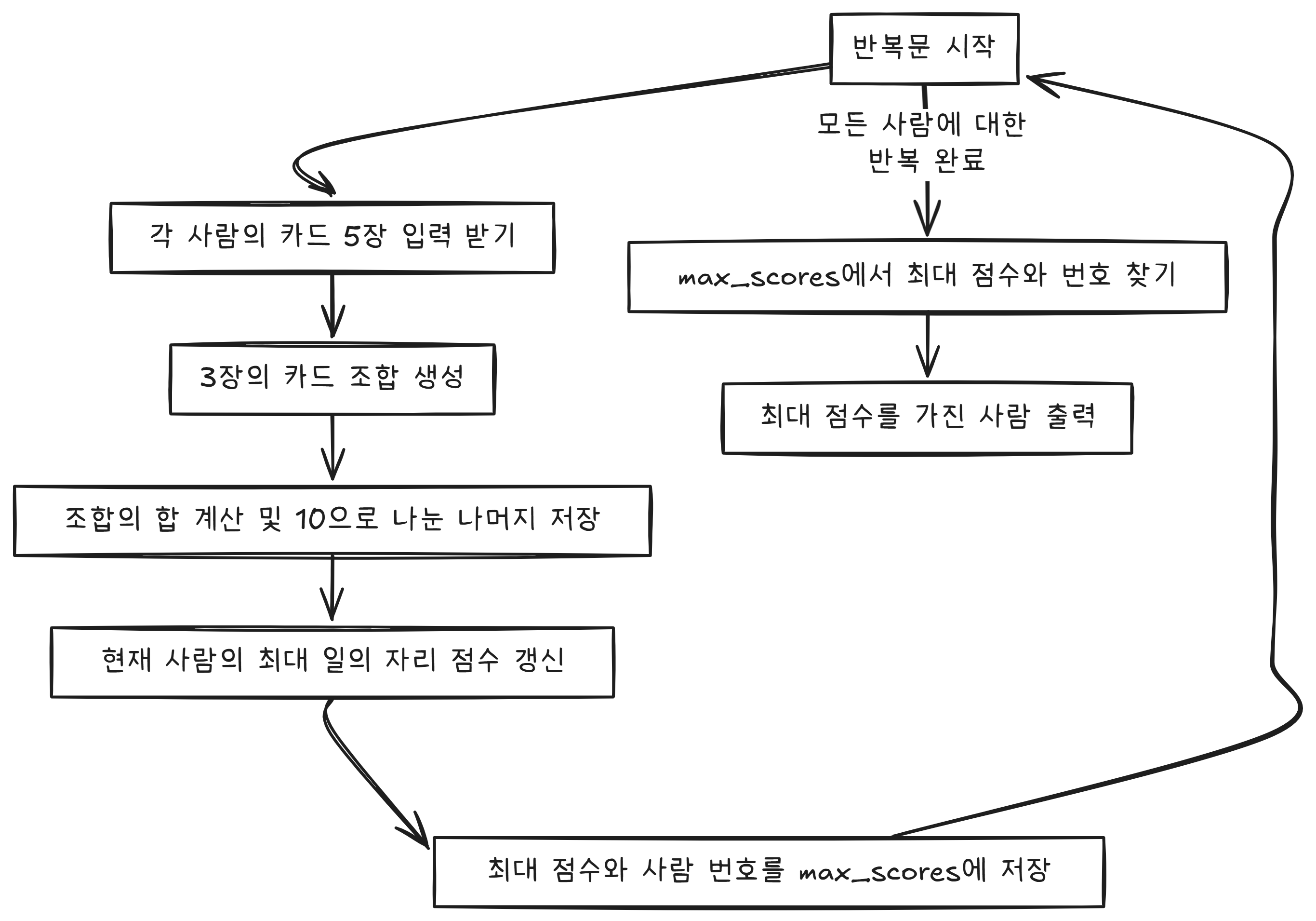 - 1의 자리를 바탕으로 결과를 출력해야 했기에 3개 카드의 합을 10으로 나눈 나머지를 score 변수에 담았고, 이 score들 간 max_score를 추출해서 리스트에 추가해줬습니다.