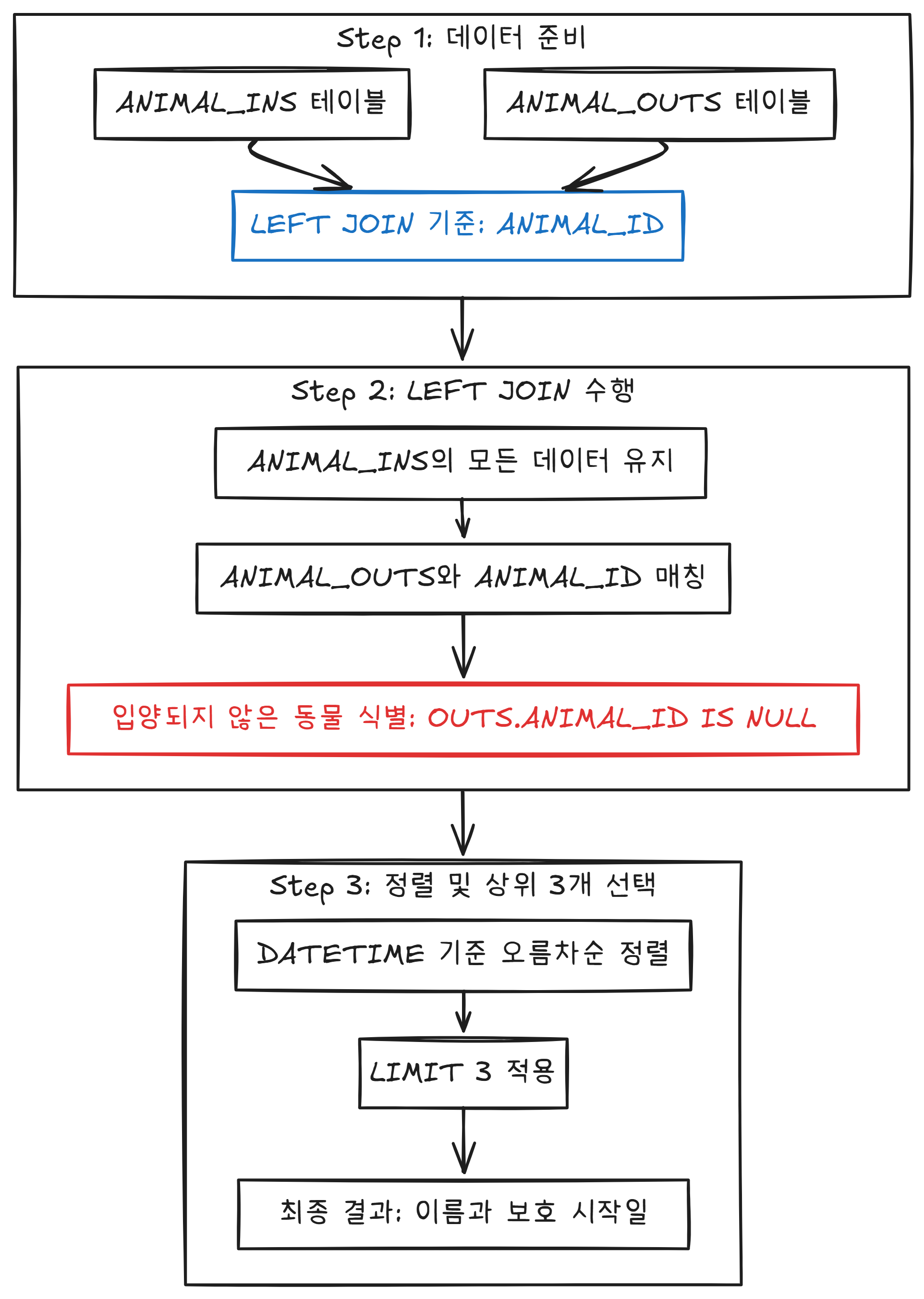 - Left Join을 사용하여 ANIMAL_INS에 있는 동물 중 ANIMAL_OUTS에 없는 데이터를 필터링해냈습니다.