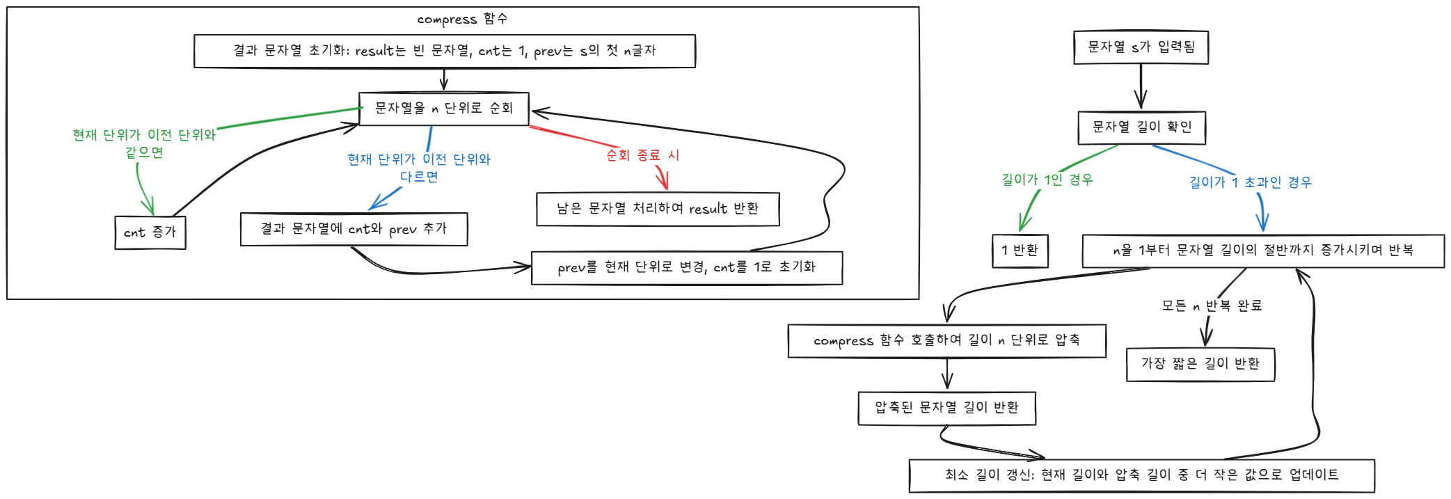 - 단위 길이가 n일 경우 문자열을 앞에서부터 길이 n 단위로 나누고, 연속된 단위가 동일할 경우에 압축, 그리고 이 압축 결과를 하나의 새로운 문자열로 조합하는 방식을 택했습니다.