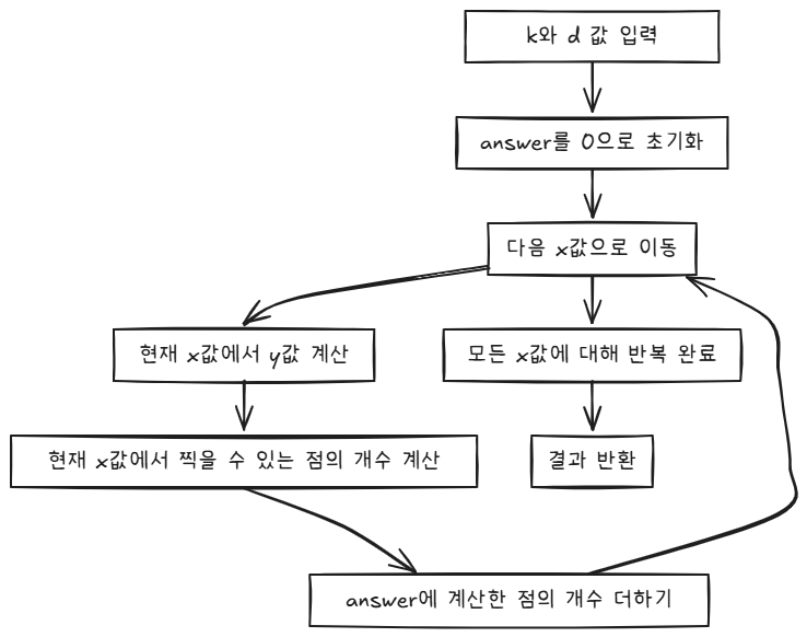 - 좌표가 이렇게 이산적이라는 특징을 지니고 있어서 완전 탐색으로 셀 수도 있겠다!! 싶었지만, k와 d의 범위가 1,000,000까지였으므로 x 좌표, y 좌표 각각 이중으로 돌리기는 힘들겠다는 판단이 섰습니다.