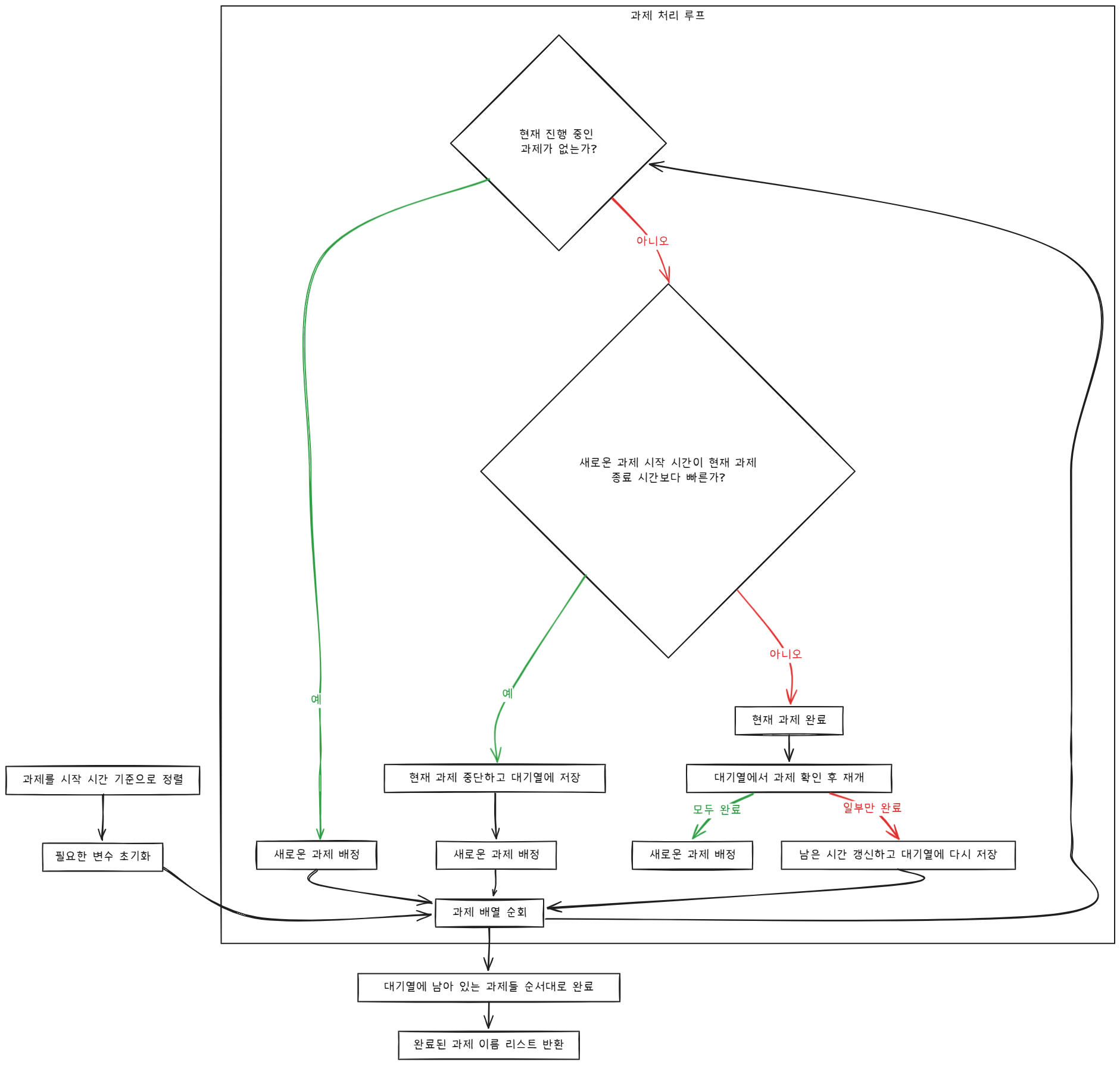 - 과제 시작하기 전, 현재 진행 중인 과제가 있는지를 확인하고, 새로운 과제의 시작 시점이 현재 과제 종료 시점보다 빠르면, 남은 시간을 계산한 뒤 현재 과제를 스택에 일시 중단한 과제로 보관합니다.