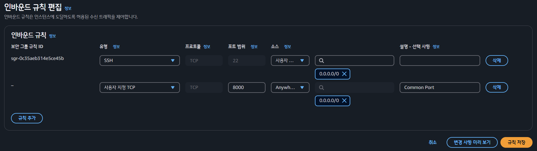 - EC2를 생성할 때에 이 보안 그룹에 해당하는 규칙을 설정하면, 규칙에 따라 서버가 작동하는 원리입니다.