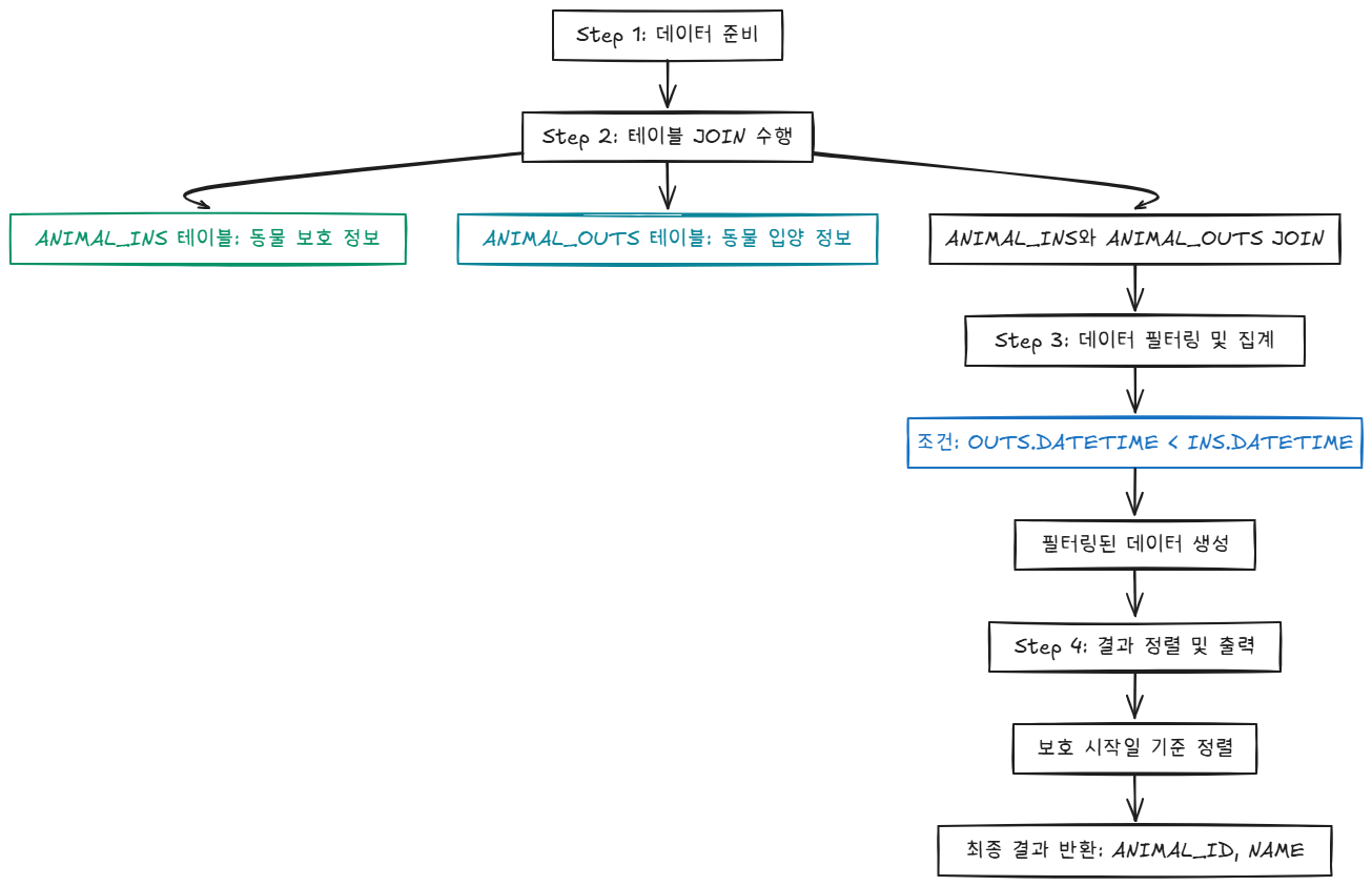 - 이후 WHERE 절을 이용해 문제에서 요구하는(보호 시작일보다 입양일이 더 빠른) 데이터만 필터링하였고,