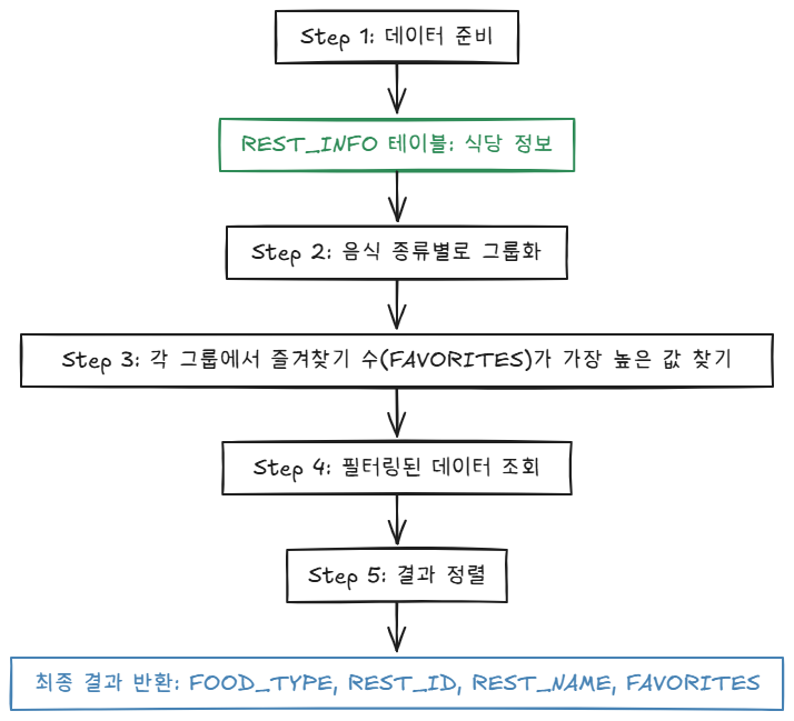- 저는 데이터를 음식 종류별로 묶은 뒤, 그룹별로 즐겨찾기 수가 가장 많은 식당을 찾아내야 했습니다. 따라서 GROUP BY로 그룹화한 뒤, MAX 구문으로 그에 해당하는 식당을 찾아낼 수 있었습니다!