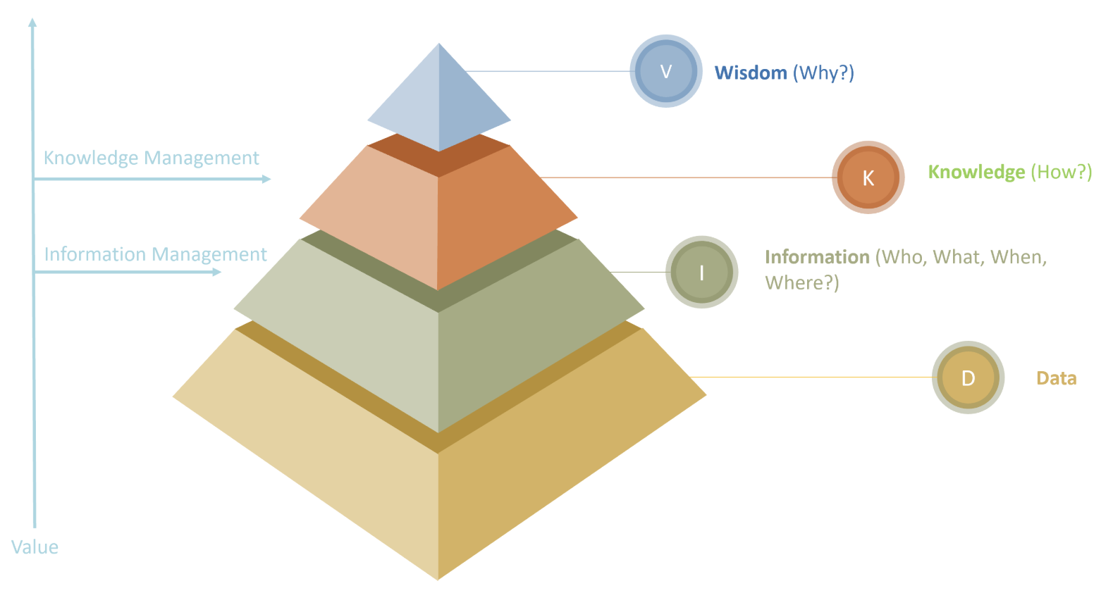 - 지식 피라미드라고도 불리며, 가장 아래 데이터(Data)로부터 시작해, 가장 위층인 지혜(Wisdom)로 끝나는 피라미드 형태입니다.