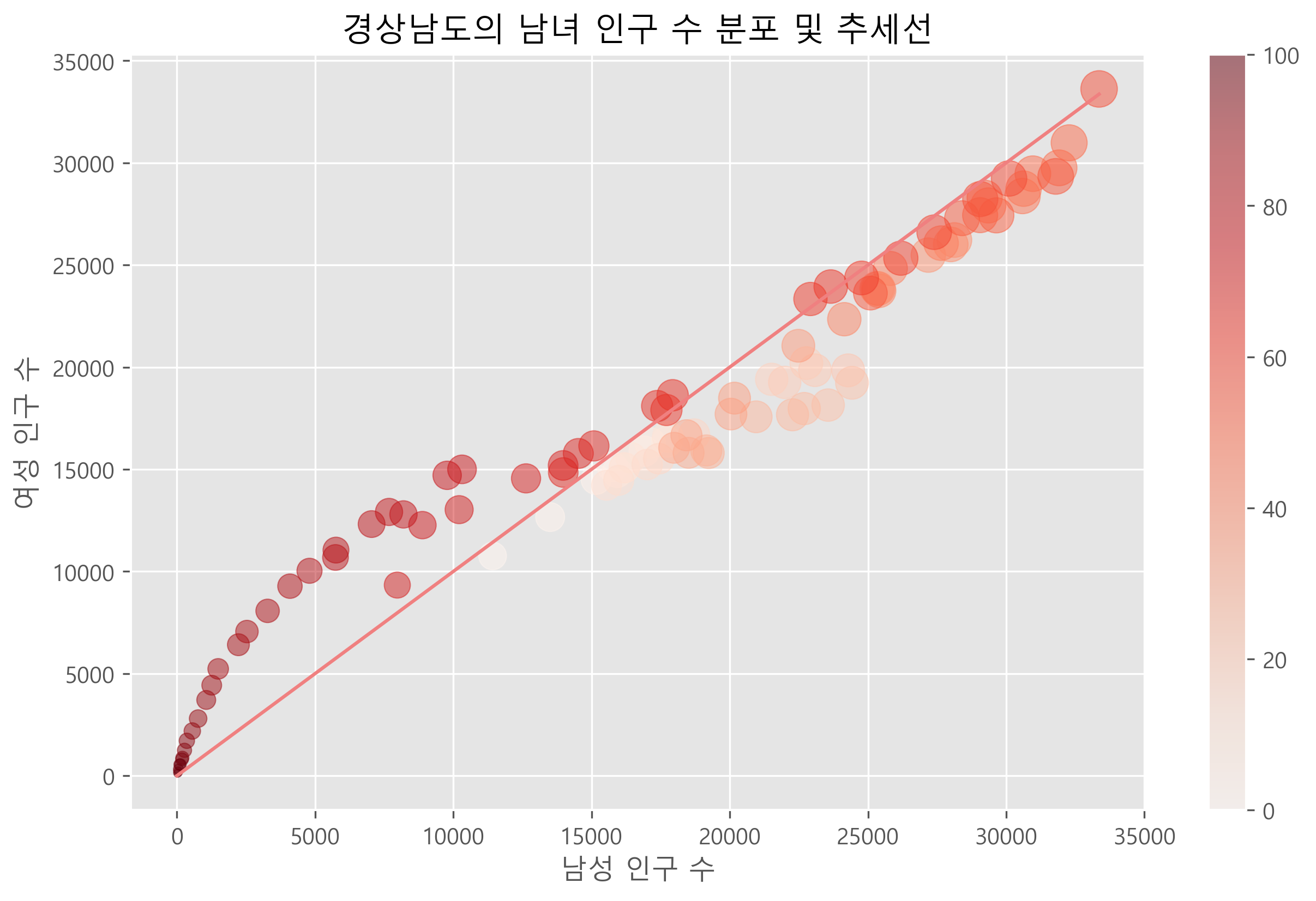 plt.title(f'{name}의 남녀 인구 수 분포 및 추세선')
