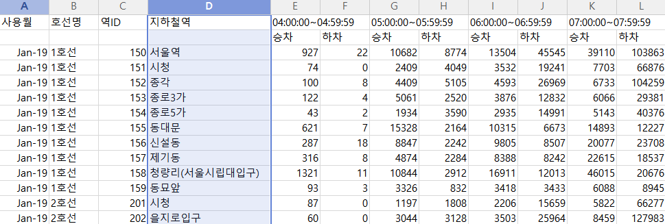 - 우선 주어진 데이터는 위와 같이 쭉 나열되어 있고, 특이하게도 오전 4시부터 오전 3시까지의 승하차 인원을 보여주고 있었습니다. 아무래도 첫차와 막차 기준인 것 같습니다.