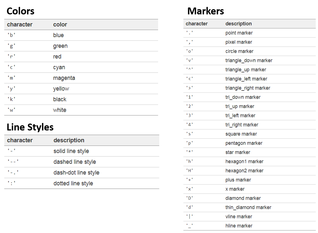 - 하단 이미지는 color, linestyle, marker 속성에 들어가는 기본적인 값들을 정리해둔 표입니다.