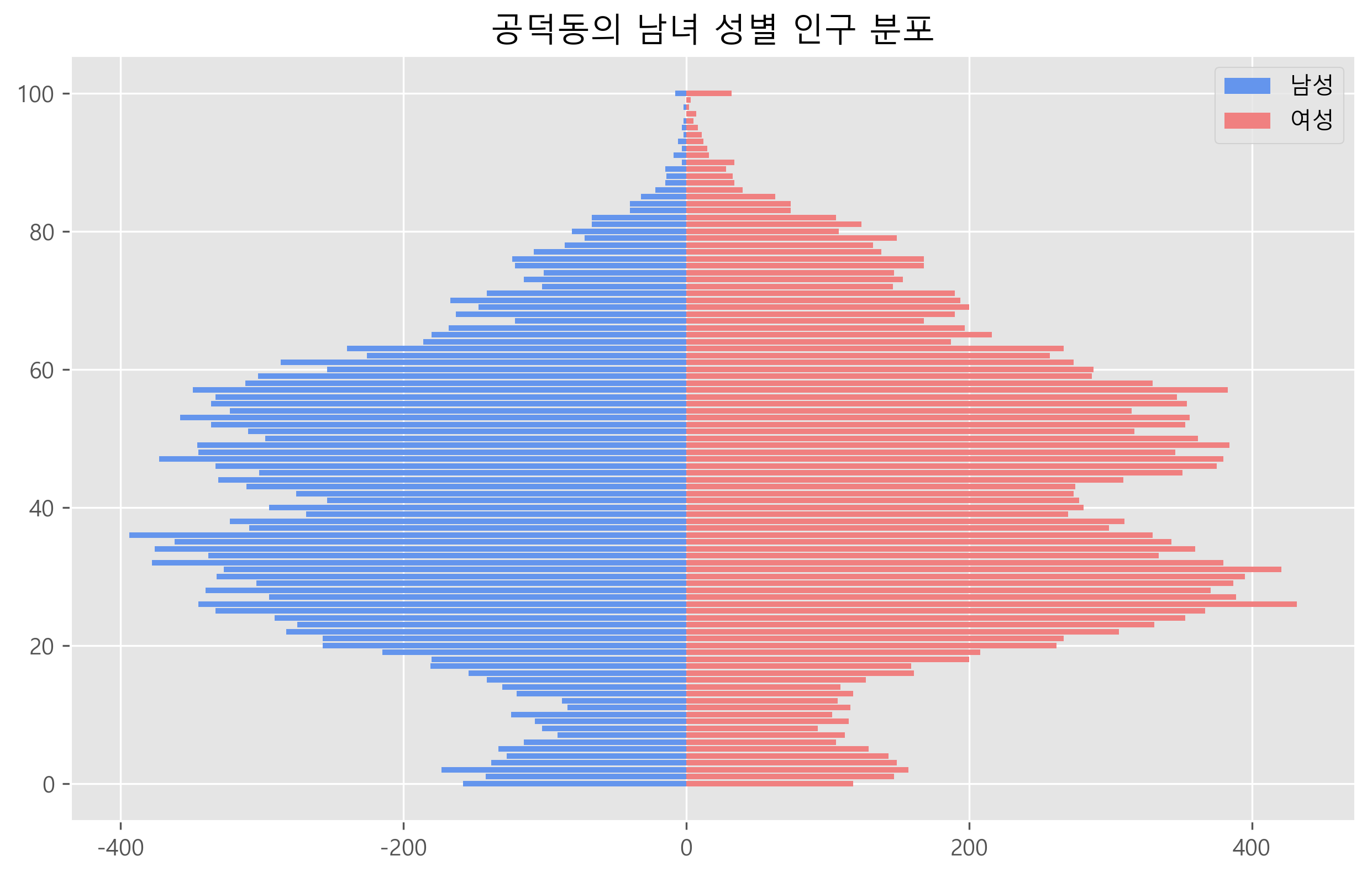 - 그래서 이러한 속성들로 matplotlib 라이브러리를 사용해 지역별로 남녀의 인구 데이터를 산점도 그래프로 시각화하는 코드는 아래처럼 구현하였습니다!