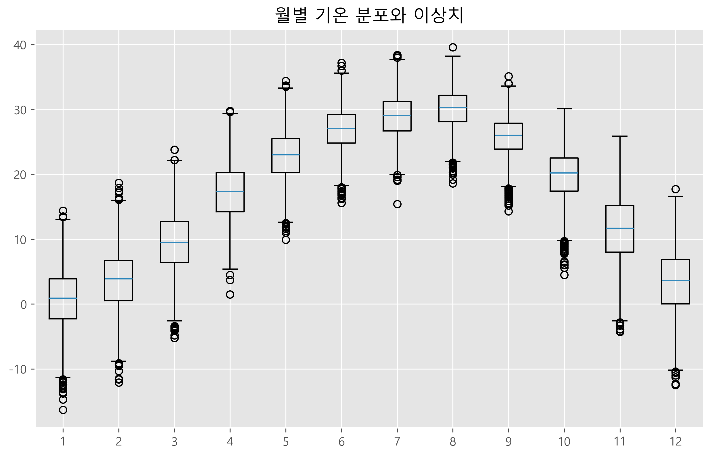 - boxplot() 함수는 이 최대값, 최소값, 상위 1/4, 2/4(중앙값), 3/4에 위치한 값(사분위수)을 한 눈에 보여주는 그래프인 Boxplot을 그려주는 함수입니다.