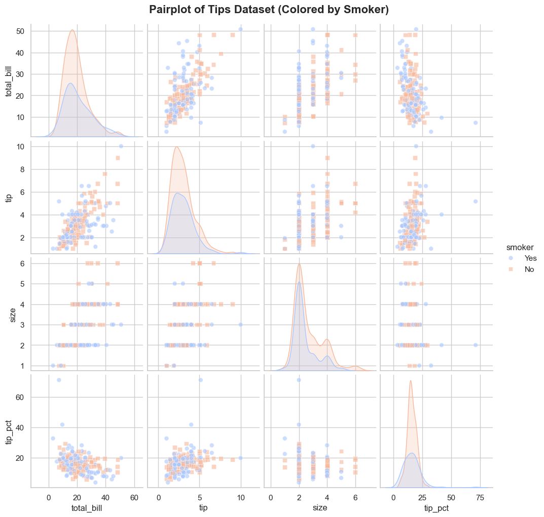 💡 sns.pairplot(data, hue=None, hue_order=None, palette=None)