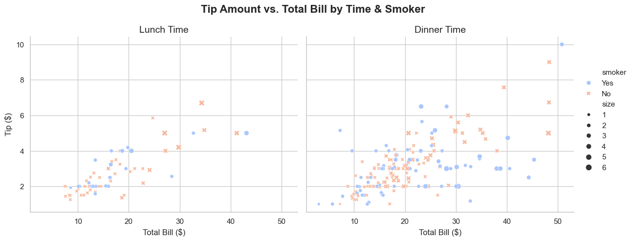 💡 sns.relplot(data=None, x=None, y=None, hue=None, size=None, style=None, row=None, col=None, kind=None)