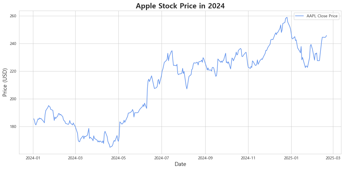 - 주식 데이터를 불러오기 위해 FinanceDataReader 라이브러리를 설치(pip install)한 후에 fdr.StockListing('KRX'), 그 중에서도 fdr.DataReader('AAPL', '2024')를 호출해서 애플 주식 데이터를 가져왔습니다.