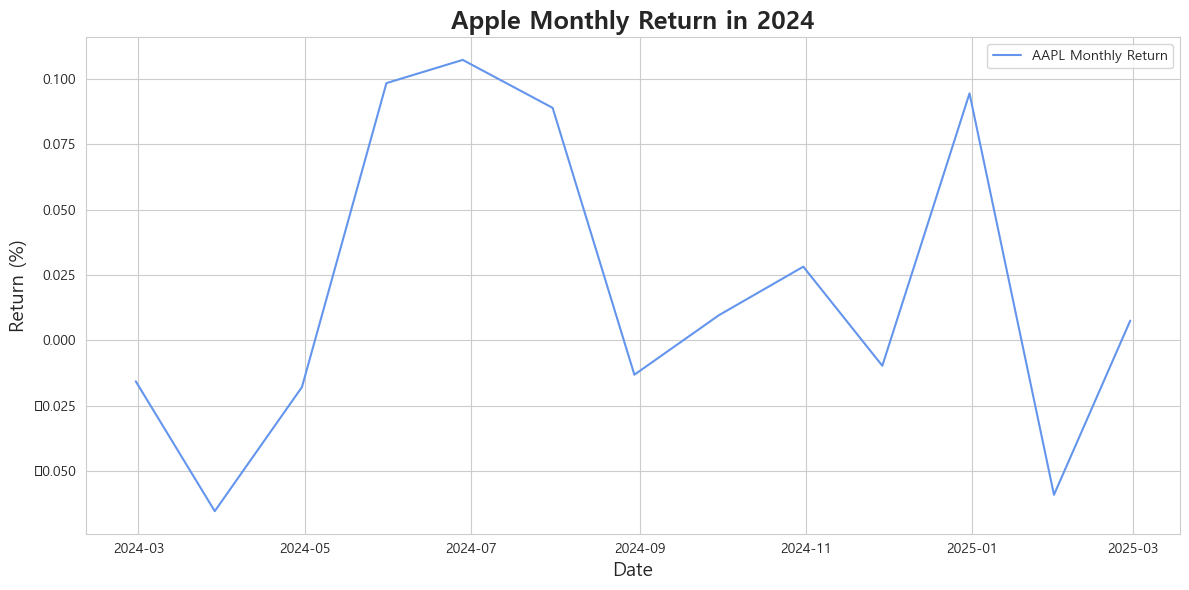 - 그래서 저희는 df.resample('BME').mean()를 사용해 한 달 간격으로 데이터를 평균시켜 줄였고, 그 데이터로 수익률((매도 가격 - 매수 가격) / 매수 가격)을 계산해 시각화해보았습니다.