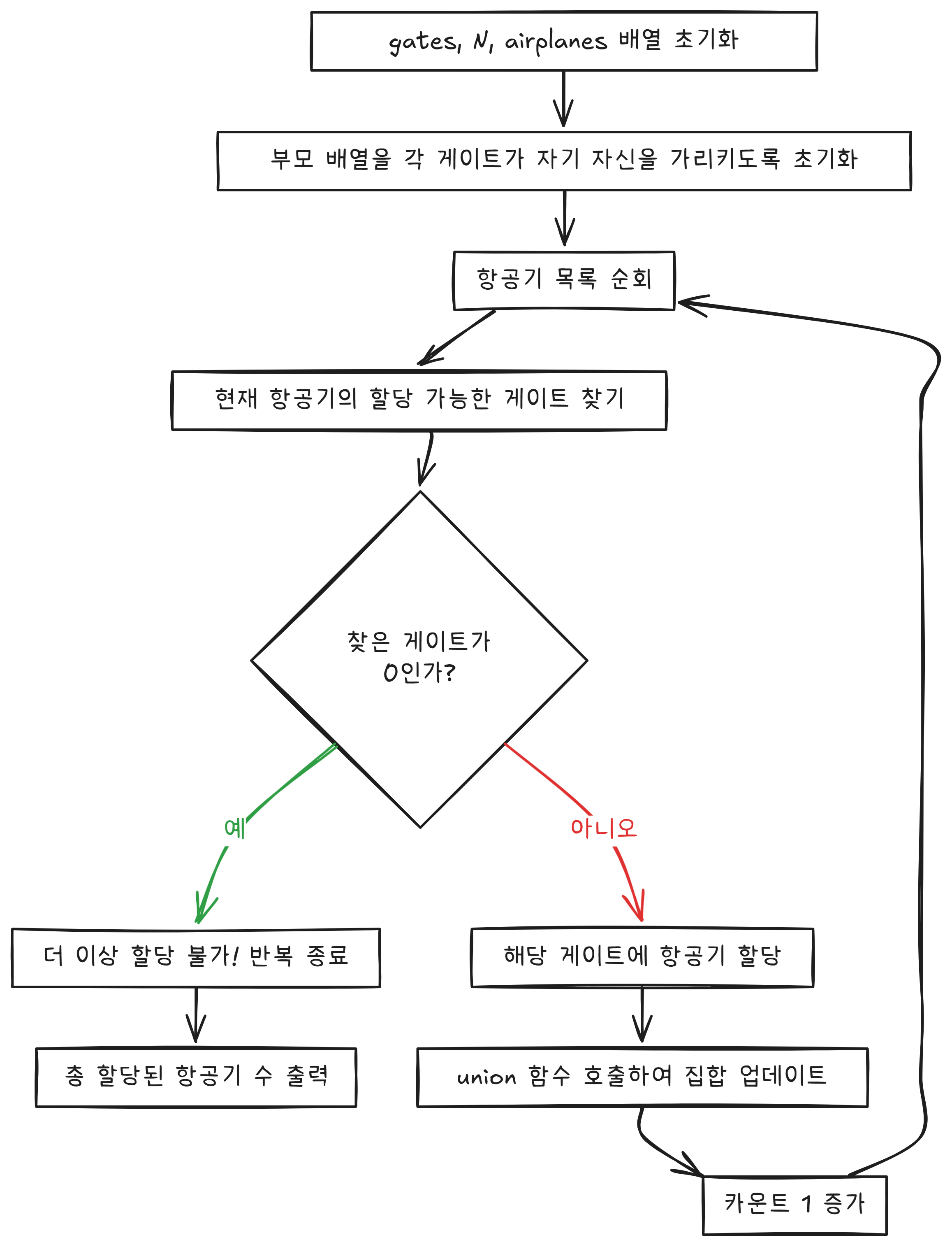 - 주어진 게이트 번호 x에서부터 시작해서, 아직 사용 가능한(자기 자신을 가리키는) 게이트를 찾아주는 역할을 수행합니다.
