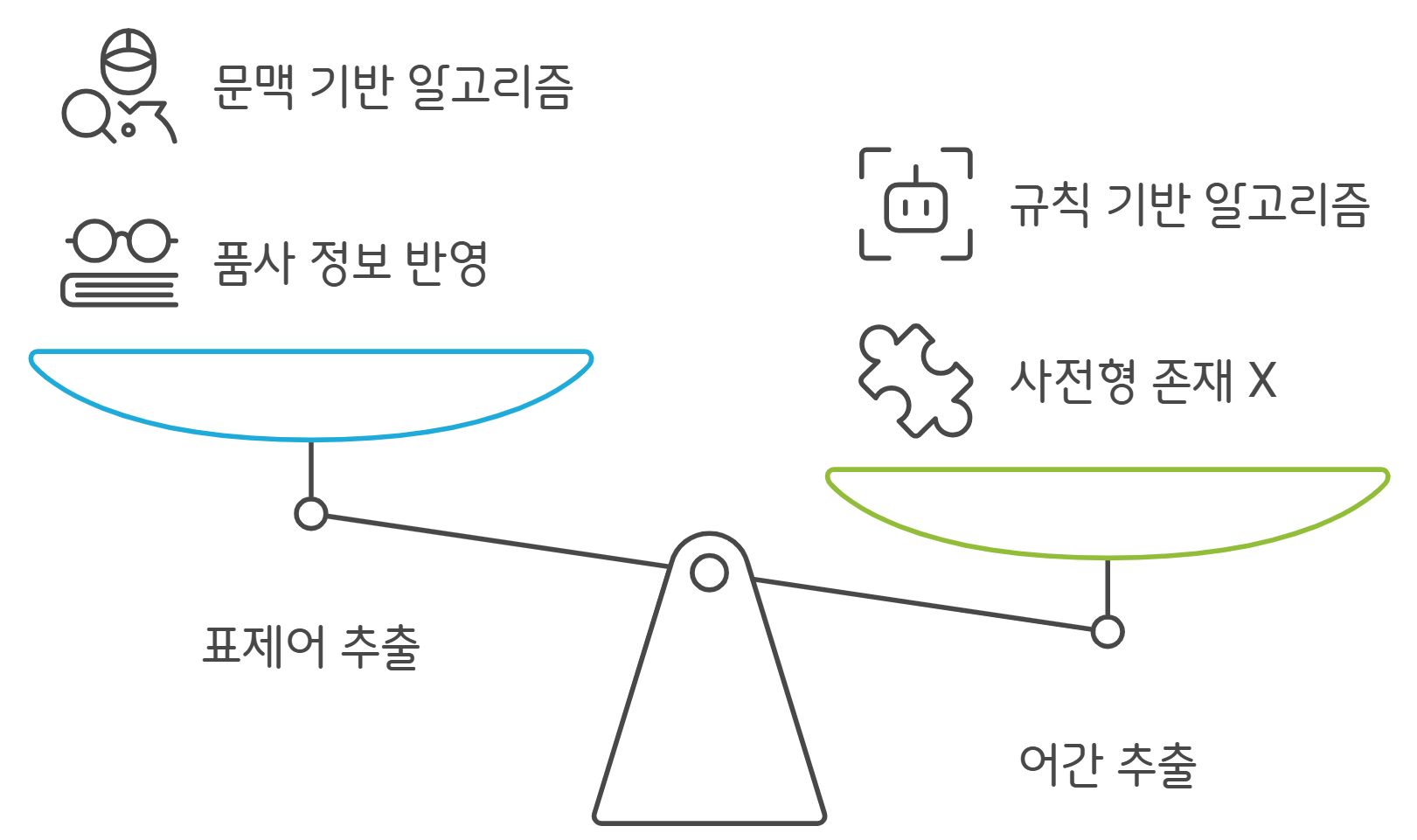 - 이런 특성 때문에 단순히 띄어쓰기만으로는 같은 의미의 단어를 올바르게 인식하기 어렵고,