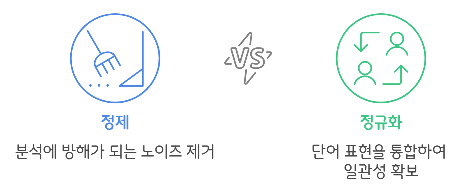 - 정제(Cleaning) 및 정규화(Normalization): 불필요한 기호 제거, 대소문자 통일, 어간/표제어 추출 등을 통해 텍스트를 정리하는 과정