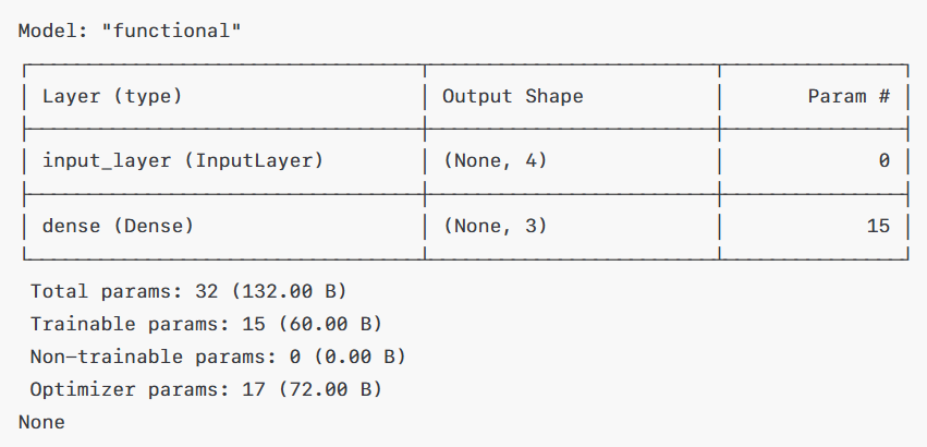 - Dense 레이어는 출력 형태가 (None, 3)이고, 각 입력 샘플에 대해 3개의 출력값(각 클래스의 확률)을 계산한다는 뜻입니다.