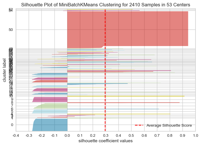 - 결과 그래프에서는 클러스터가 53개로 많아, 일부 클러스터가 얇게 나타나거나 음수 영역까지 뻗어 있는 것을 확인할 수 있었습니다.