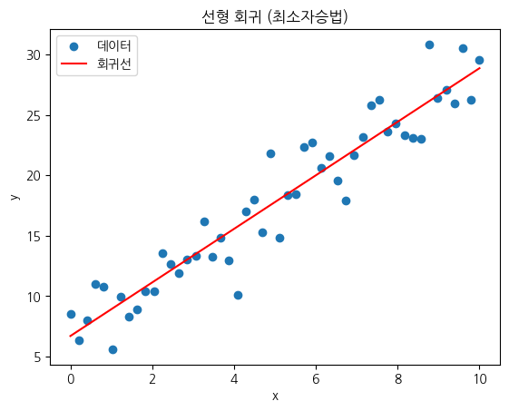 - 선형 회귀에서는 최소자승법을 통해 데이터와 가장 잘 맞는 직선을 찾게 됩니다.