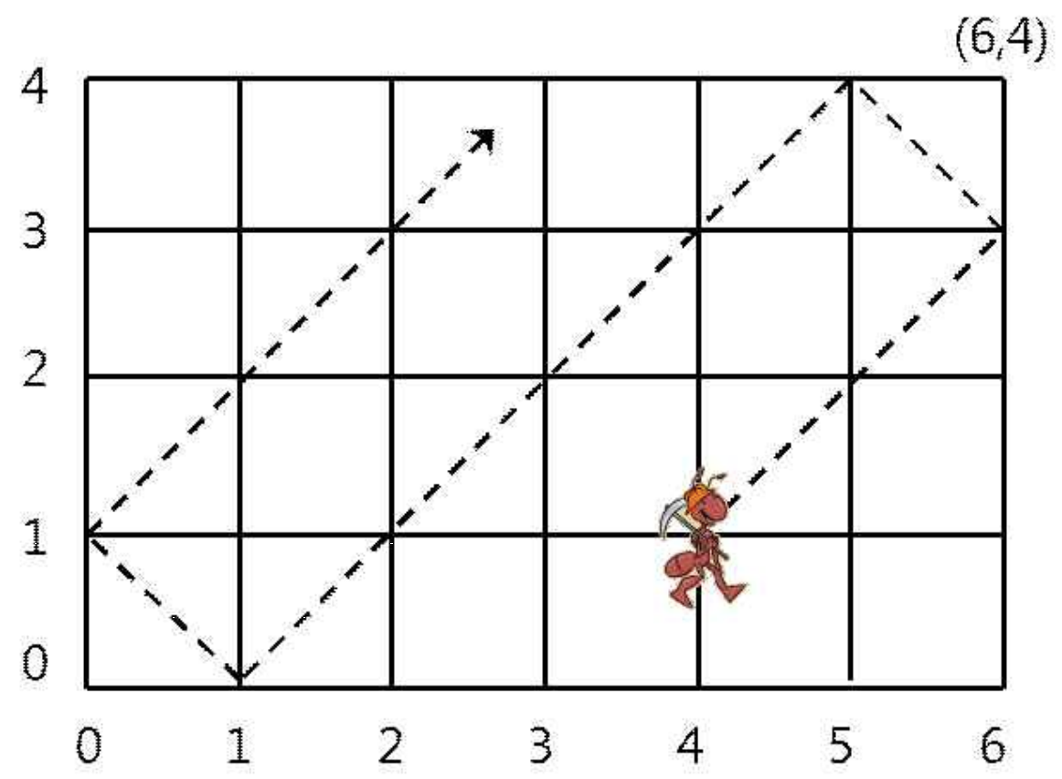 - 위 그림은 6×4 격자에서 처음에 (4,1)에서 출발한 개미가 움직인 길을 보여주고 있다. 처음에 (4,1)에 있는 개미는 2시간 후에 (6,3)에 있으며 8시간 후에 (0,1)에 있다. 만일 그 개미가 처음에 (5,3)에 있었다면 매 시간마다 (6,4), (5,3), (4,2), (3,1)로 움직인다.