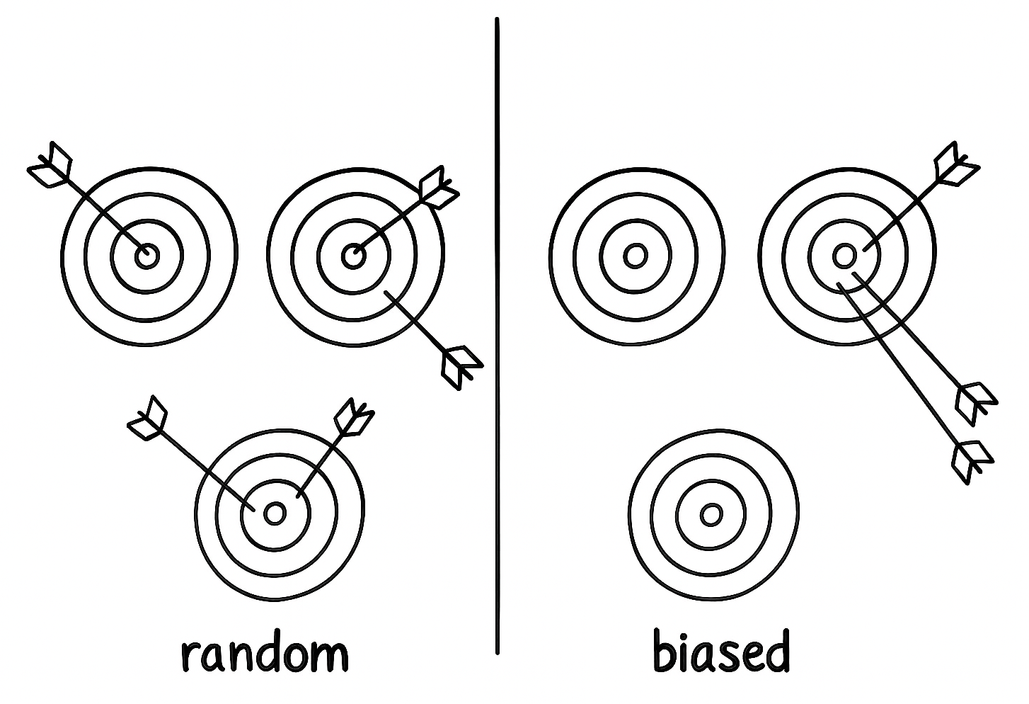 - 그리고 이 표본 오차를 제외한 변동(차이)을 비표본 오차라고 합니다. 여기 이 비표본 오차의 한 원인이 바로 편향입니다. 다시 말해, 편향은 표본에서 나타나는 모집단과의 체계적인 차이입니다. 즉, 무작위가 아니라 일정한 방향으로 왜곡된 차이를 말합니다.