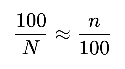 - 왼쪽 분수는 전체 모집단 N마리 중에서 처음 포획해 표식을 남겼던 100마리 길고양이를 뜻하고, 오른쪽은 두 번째로 포획했던 100마리 길고양이 중에서 표식이 남아있는 n마리의 길고양이를 뜻합니다.
