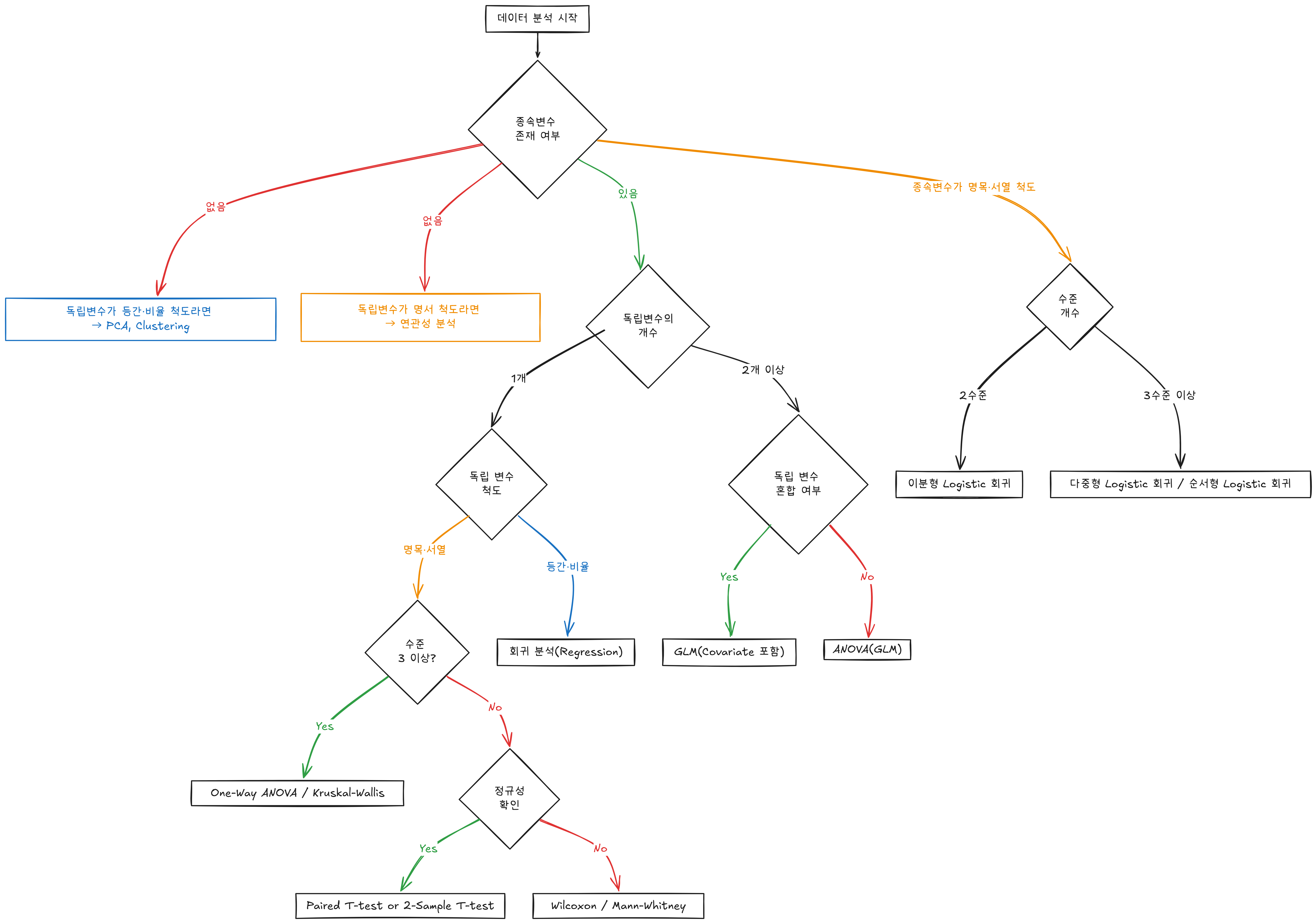 - 위 다이어그램이 변수의 척도와 관계에 따라 어떤 분석 방법을 선택해야 하는지 나타내고 있는데, 일단은 참고만 해두면 좋을 것 같습니다 ! (작아서 보이지도 않네)