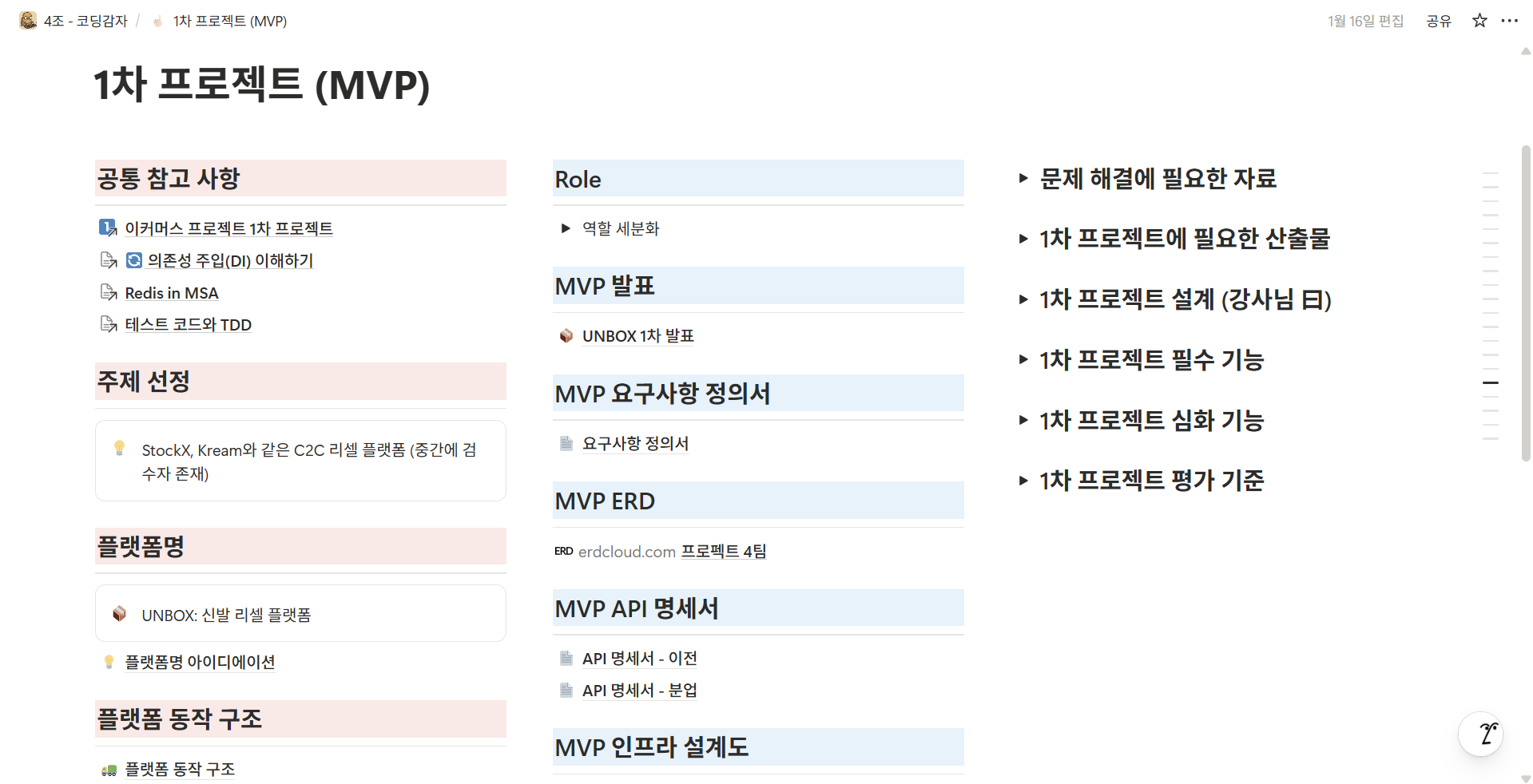 - 처음에는 모놀리식 아키텍처로 시작해 MVP를 빠르게 구현했습니다. 이 과정에서 Notion을 활용해 요구사항 정의서, API 명세서, ERD 등을 체계적으로 문서화하며 협업의 기초를 다졌습니다.