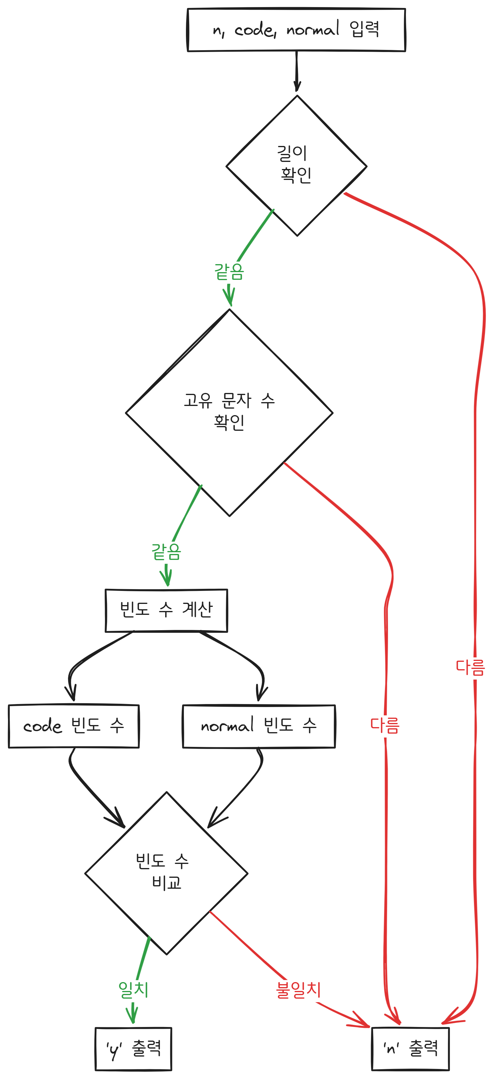 - 단순히 변환된 문자가 평문에 들어있는지만을 판단하는 것이 아닌, 빈도 수까지 맞춰야하는 문제였습니다.