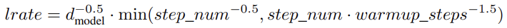 - 처음 warmup steps 동안 학습률을 선형적으로 증가시킨 후 단계 수의 역제곱근에 비례하여 감소